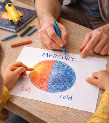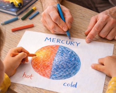 Draw Mercury and color red for the hot daytime side and blue for the freezing nighttime side. Ask: “Which side would you like to visit?”