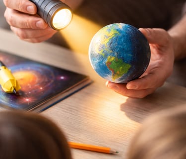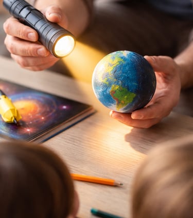 Show your child a flashlight and a small ball to explain day and night. Spin the ball slowly to demonstrate how one side is heated by the Sun while the other side is cold.